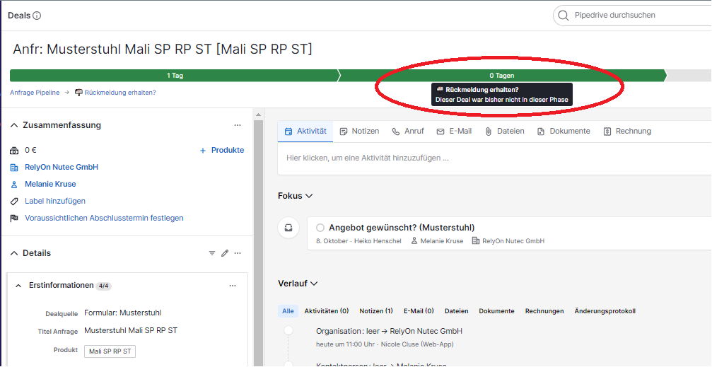 - DEAL in die nächste Phase schieben, damit er auch „Anfrage prüfen“ (Pipedrive EINGANG) raus kommt: