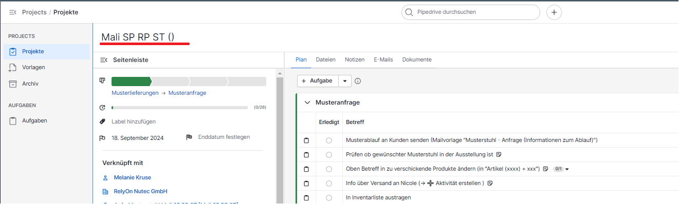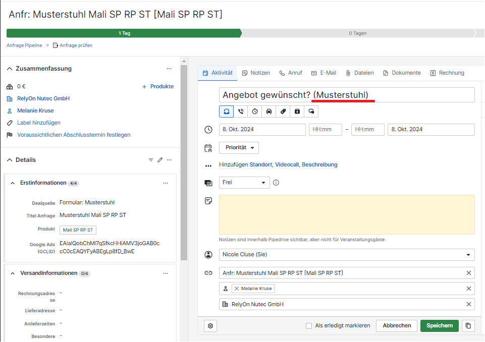 Diese Anleitung erklärt das Vorgehen in Pipedrive, wenn eine Musterstuhlanfrage über das Online Formular eingeht.