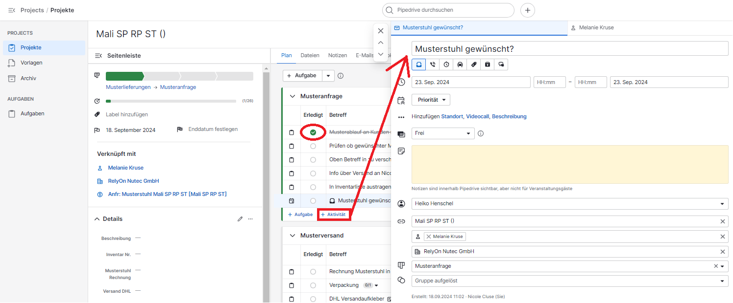 - Erledigte Aufgaben abhaken und ➕Aktivität erstellen „Musterstuhl gewünscht?“: